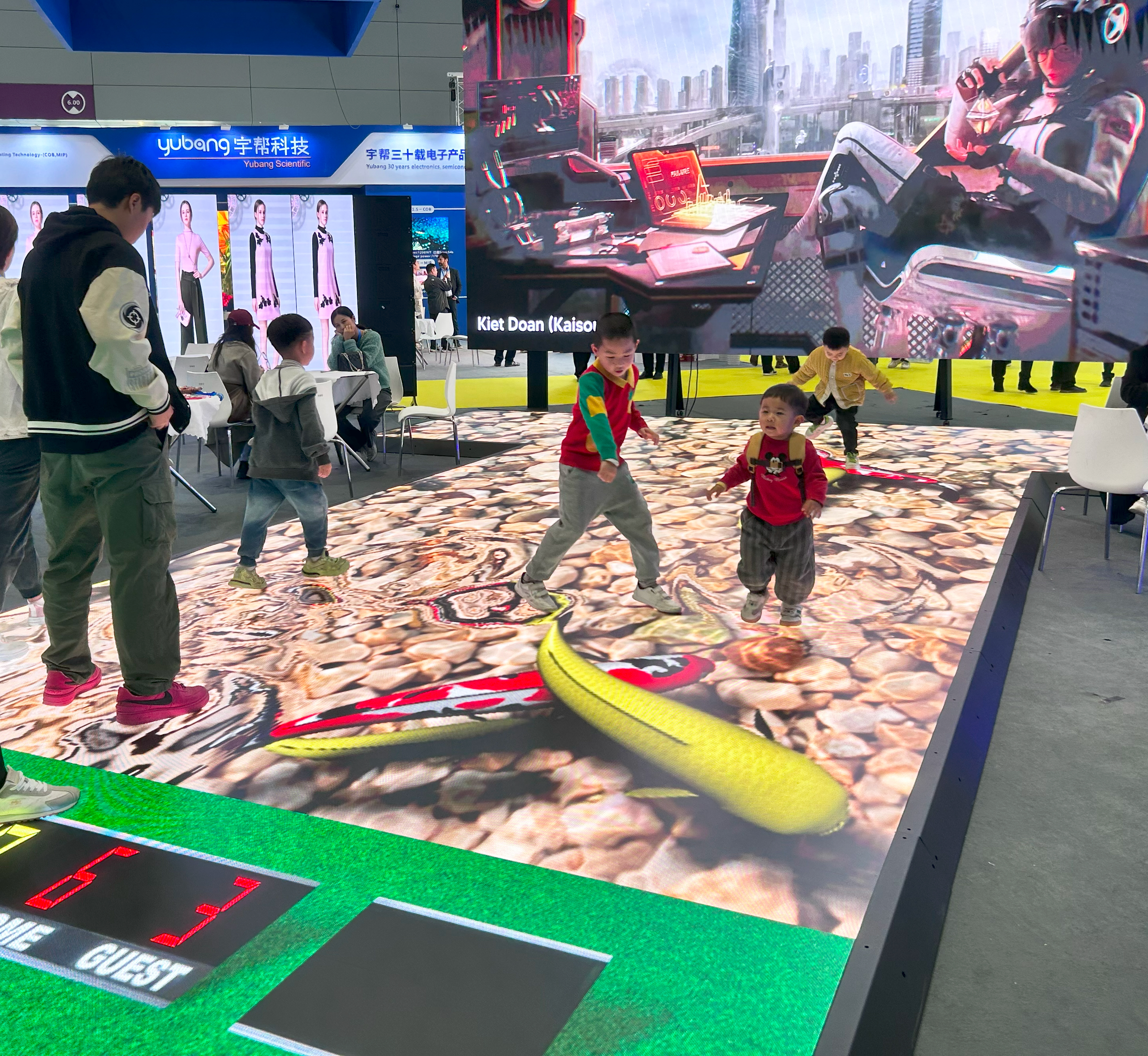 孩童踢球時,屏幕實時追蹤足球軌跡,模擬草皮滾動效果,增強競技趣味;當參觀者緩步經(jīng)過時,錦鯉悠然擺尾游弋;疾步奔跑時,魚群如受驚般靈動四散,實時生成的水波漣漪與腳步同頻共振,虛實交融宛若‘踏波而行’。孩子們興奮地追逐著屏幕里的魚群,或輕移慢探、或蹦跳追逐,實時互動引爆全場歡潮。